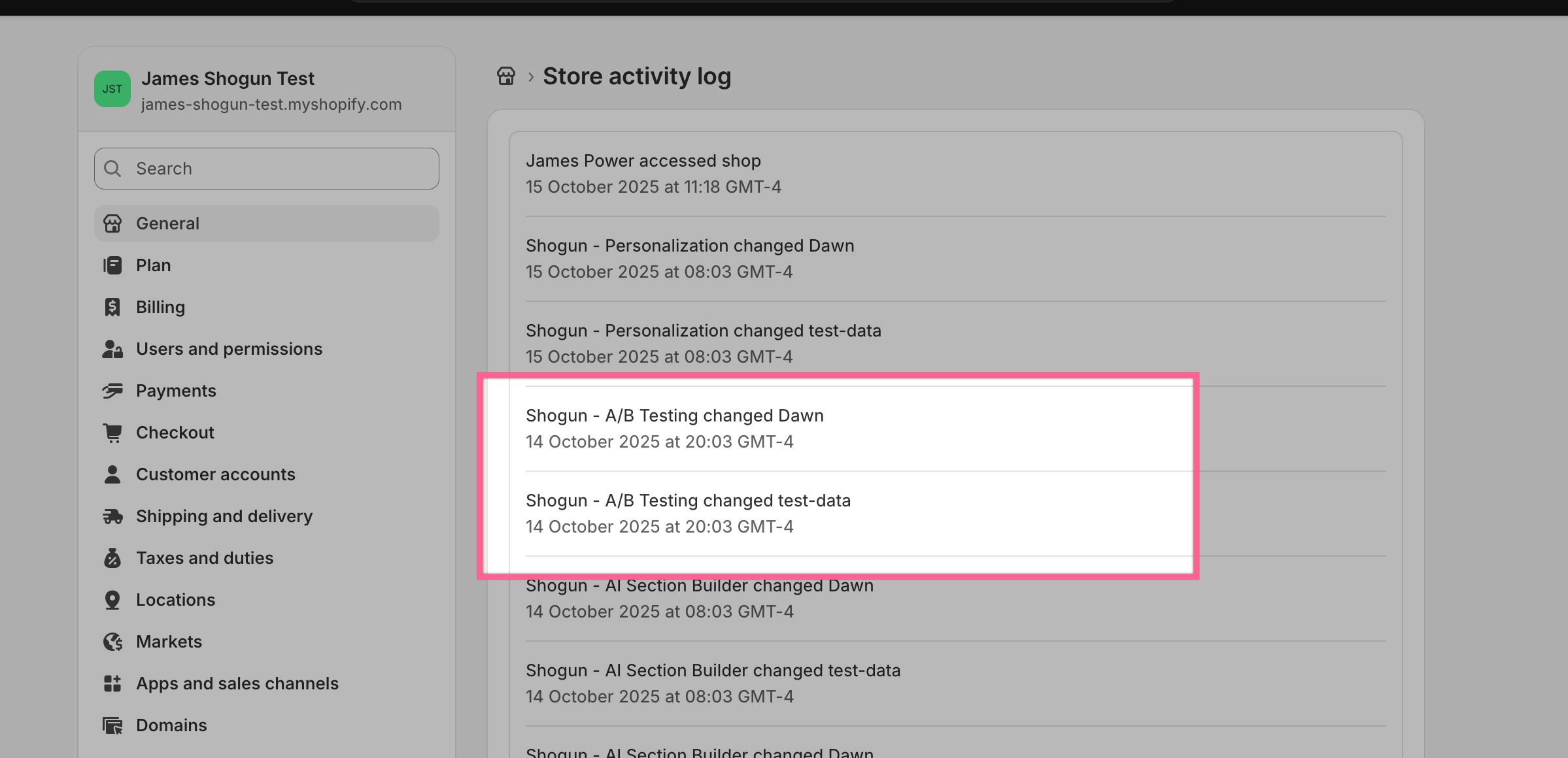 You may notice occasional Shogun-related activity appearing in your store’s activity log. This is completely normal and expected behavior.